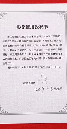 “牡丹花”“怡飾家”品牌是公司主營(yíng)的注冊(cè)商標(biāo),并與明星句號(hào)達(dá)成合作。14年的板材專業(yè)精神和持續(xù)穩(wěn)健的行業(yè)資源優(yōu)化整合。